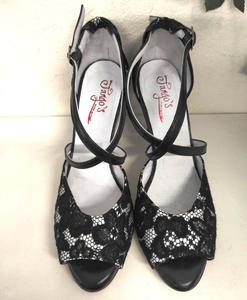 Sandalo realizzato interamente a mano in Italia, realizzato in morbido e resistente tessuto di raso e pizzo nero, rifinito internamente con vera pelle, incrocio con lacci di vernice nera.