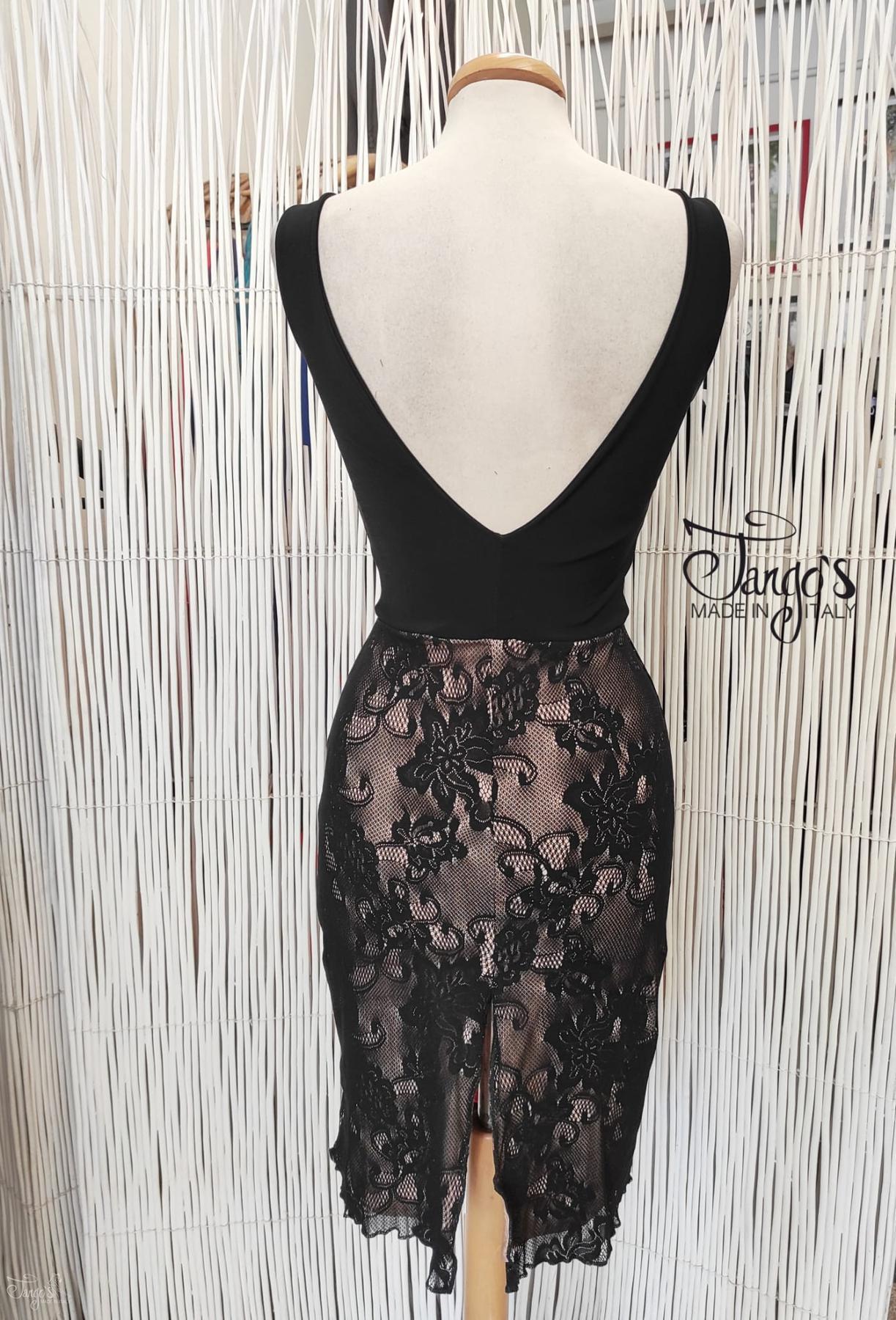 Abito tubino realizzato in morbido jersey e pizzo elasticizzato, gonna in pizzo con fodera beige e particolare inserto sul davanti.