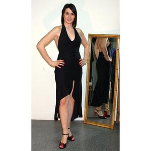 Incantevole abito tango scollo a V davanti e dietro, gonna a due punte intessuto elasticizzato fondo nero lavorato con perline e brillantini che esaltano la sensualità del movimento e il fascino della donna che lo indossa.